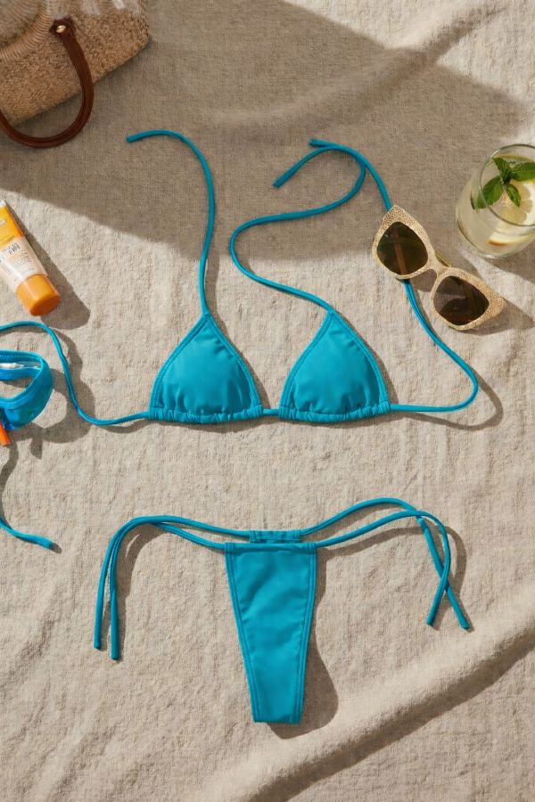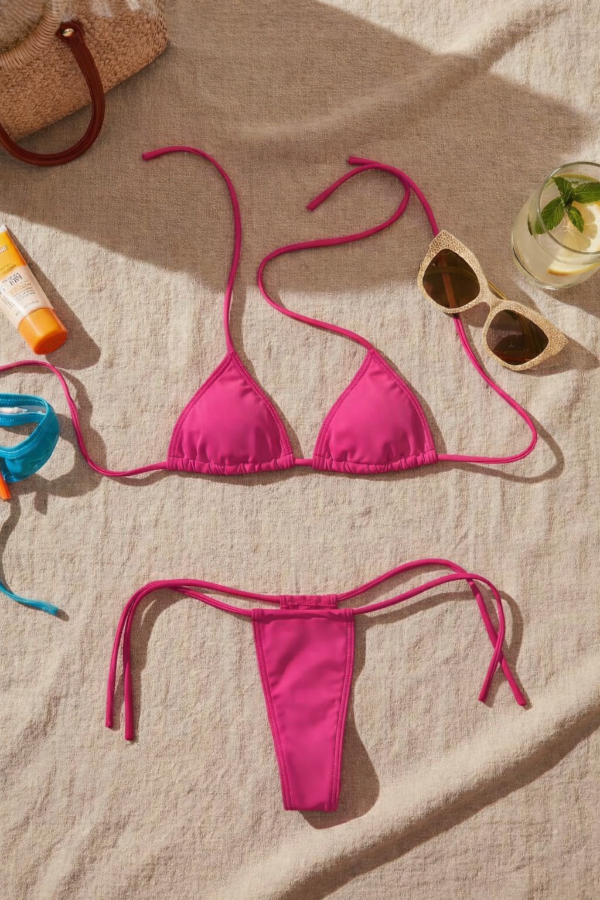 El lazo al cuello permite regular el sostén del busto, mientras que la bombacha hilo regulable se adapta cómodamente al cuerpo.